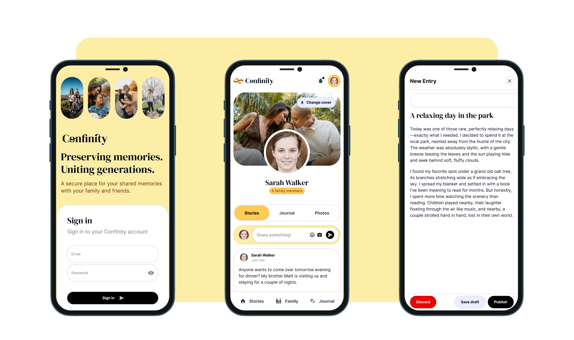 Explore how Confinity brings memories to life through our intuitive and innovative platform. Our application offers a seamless experience designed to preserve and celebrate your digital legacy. Below are some key screens from our app: